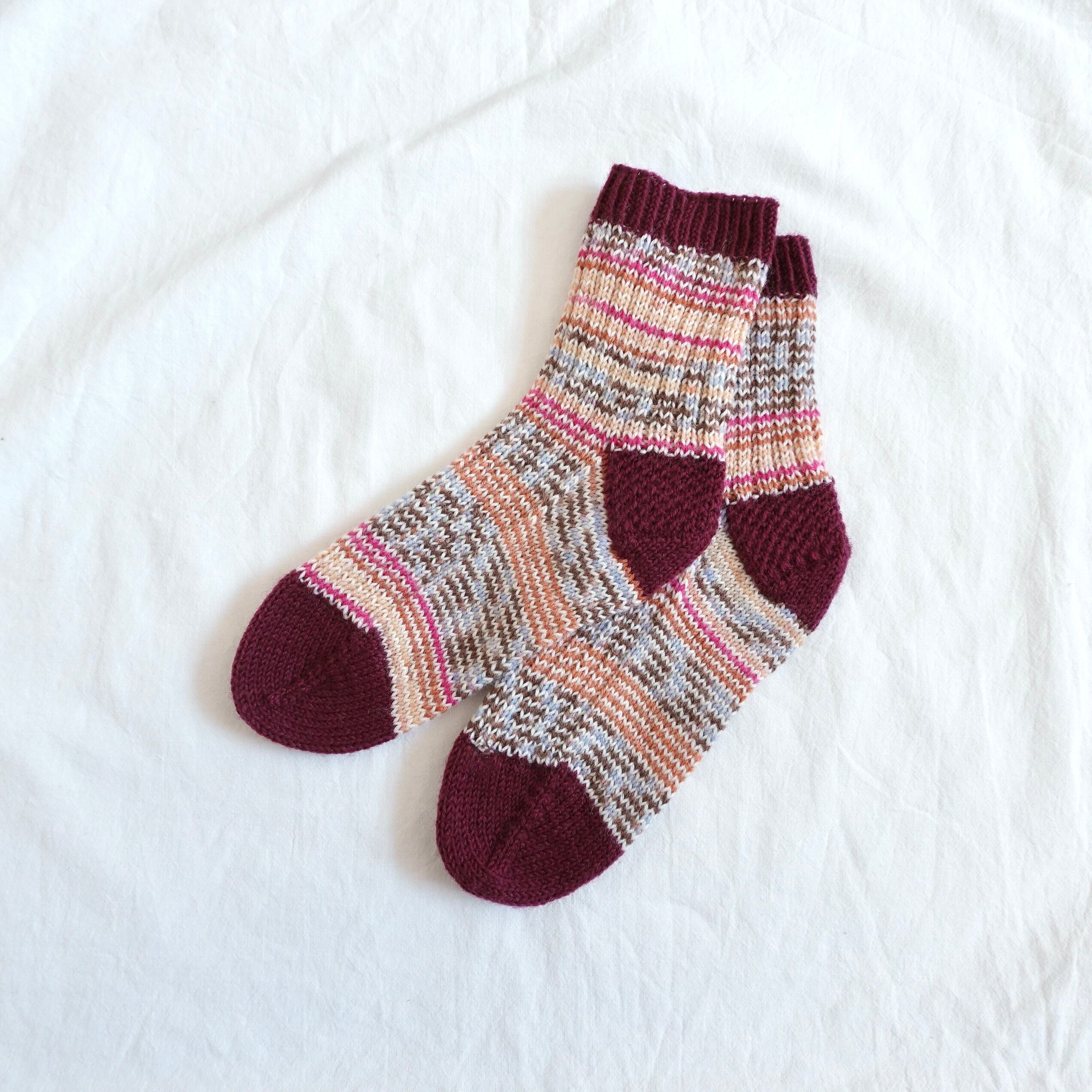 オレンジやブラウンがメインの毛糸で編んだ靴下です。